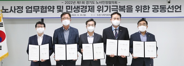°æ±âµµ³ë»ç¹ÎÁ¤ÇùÀÇȸ Âü¿© ±â°üµéÀÌ ¹Î»ý°æÁ¦ À§±â ±Øº¹°ú ½Çõ°úÁ¦ ¹ß±¼À» À§ÇØ °øµ¿ Çù·ÂÇÏ´Â ÇÑÆí, ź¼ÒÁ߸³ »ê¾÷Àüȯ¿¡ µû¸¥ ³ëµ¿¡¤ÀÏÀÚ¸® °øÁ¤ÇÑ ÀüȯÀ» À§ÇØ ÈûÀ» ¸ðÀ¸±â·Î ÇÕÀÇÇß´Ù.