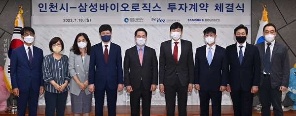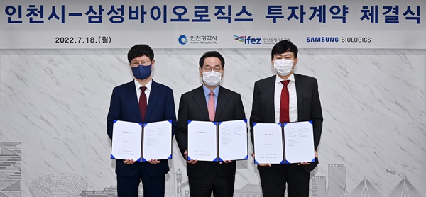 'ÀÎõ½Ã-»ï¼º¹ÙÀÌ¿À·ÎÁ÷½º ÅõÀÚ°è¾à ü°á½Ä'¿¡¼ ¼º¿ë¿ø ÀÎõ°æÁ¦ÀÚÀ¯±¸¿ªÃ» Â÷Àå(¿ÞÂʺÎÅÍ), À¯Á¤º¹ ÀÎõ±¤¿ª½ÃÀå, Á¸¸² »ï¼º¹ÙÀÌ¿À·ÎÁ÷½º ´ëÇ¥À̻簡 Çù¾à¼¸¦ ü°áÇÏ°í ±â³äÃÔ¿µÀ» Çϰí ÀÖ´Ù