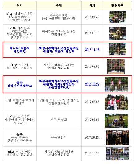 È­¼º½Ã ÃßÁøÀ§´Â ¾Õ¼­ 2015³â 11¿ù ij³ª´Ù Åä·ÐÅä ÇÑÀÎȸ°ü, 2016³â 10¿ù Áß±¹ »óÇÏÀÌ»ç¹ü´ëÇб³¿¡µµ ¼Ò³à»óÀ» ¼³Ä¡ÇÑ ¹Ù ÀÖ´Ù. À̹øÀ» Æ÷ÇÔÇϸé ÇØ¿Ü 10°³ ¼Ò³à»ó Áß 3°³¼Ò °Ç¸³¿¡ È­¼º½Ã¹ÎÀÌ Èû²² ÇÑ °ÍÀÌ´Ù.