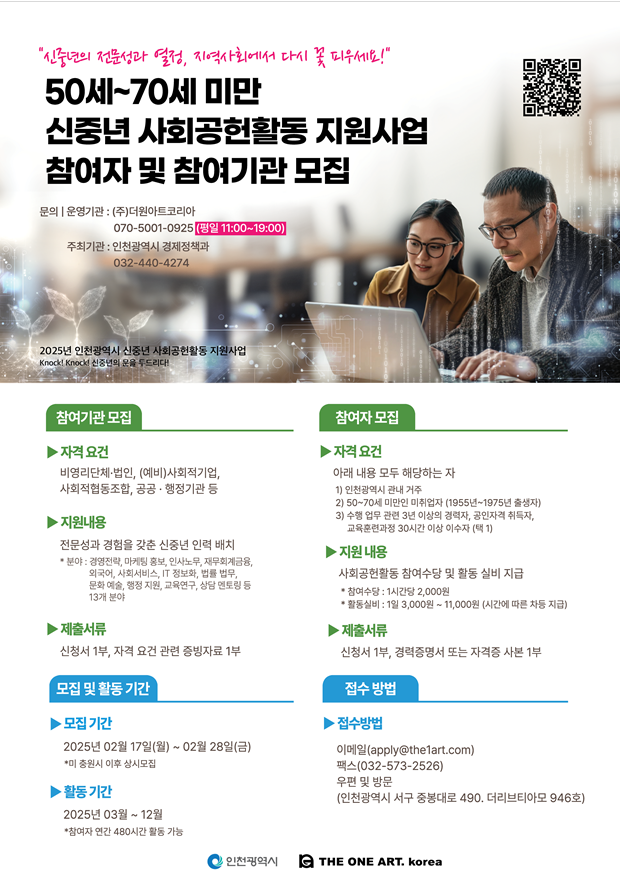 ÀÎõ±¤¿ª½Ã(½ÃÀå À¯Á¤º¹)´Â 50~60´ë ¹ÌÃë¾÷ ½Ã¹Î°ú ºñ¿µ¸®±â°üÀ» ´ë»óÀ¸·Î ¡®2025³â ½ÅÁ߳⠻çȸ°øÇåȰµ¿ Áö¿ø»ç¾÷¡¯ÀÇ Âü¿©ÀÚ¿Í Âü¿©±â°üÀ» ÀÌ´Þ 28ÀϱîÁö ¸ðÁýÇÑ´Ù°í ¹àÇû´Ù.