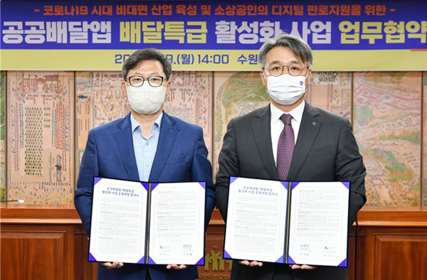 ¹Ú»ç½Â ¼ö¿ø½Ã °æÁ¦Á¤Ã¥±¹Àå(¿ÞÂÊ)°ú À̼®ÈÆ °æ±âµµÁÖ½Äȸ»ç ´ëÇ¥À̻簡 19ÀÏ ¼ö¿ø½Ãû »óȲ½Ç¿¡¼ '°æ±âµµ °ø°ø¹è´Þ¾Û ¹è´ÞƯ±Þ Ȱ¼ºÈ »ç¾÷ ¿î¿µ´ëÇà ¾÷¹«Çù¾à'À» ü°áÇÏ°í ±â³äÃÔ¿µÀ» Çϰí ÀÖ´Ù