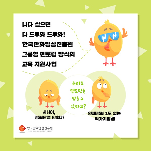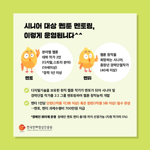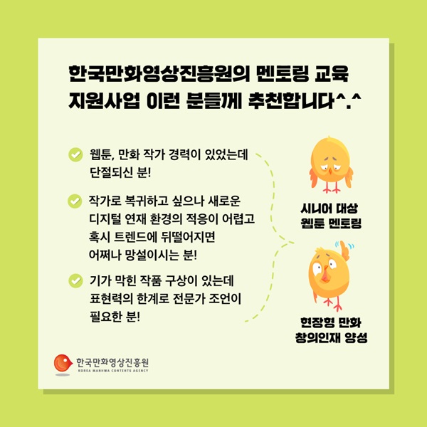 µ¥ºß °æ·ÂÀÌ ¾ø´Â ÀÛ°¡Áö¸Á»ý¿¡°Ô ÇÑÁ¤µÆ´ø Çѱ¹¸¸È­¿µ»óÁøÈï¿øÀÇ ¸àÅ丵 ±³À° Áö¿ø»ç¾÷ÀÌ ¡®½Ã´Ï¾î ´ë»ó À¥Å÷ ¸àÅ丵¡¯À¸·Î ÁßÀå³â °æ·Â´ÜÀý ÀÛ°¡¿¡°Ô È®´ë ¿î¿µµÈ´Ù.