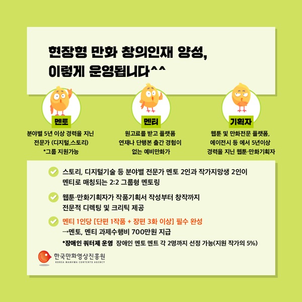 ¡®ÇöÀåÇü ¸¸È­ âÀÇÀÎÀç ¾ç¼º »ç¾÷¡¯Àº ÀÛ°¡Áö¸Á»ýÀÎ ¸àƼ°¡ µðÁöÅÐ ±â¼ú, ½ºÅ丮ÅÚ¸µ µî °¢ ºÐ¾ß Àü¹®°¡ ¸àÅäÀÇ °æÇè°ú ³ëÇϿ츦 °øÀ¯Çϸç âÀÛ¹°ÀÇ ¿Ï¼ºµµ¸¦ ´Ù°¢ÀûÀ¸·Î ³ôÀÏ ¼ö ÀÖ´Â ÀÎÀç¾ç¼º ÇÁ·Î±×·¥ÀÌ´Ù.